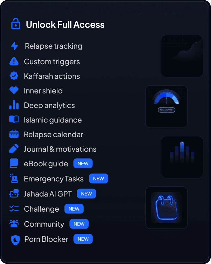 Membantu anda menewaskan dorongan seksual menggunakan motivasi al-Quran, penjejakan pencetus (trigger tracking), porn blocker dan sistem habit harian.
